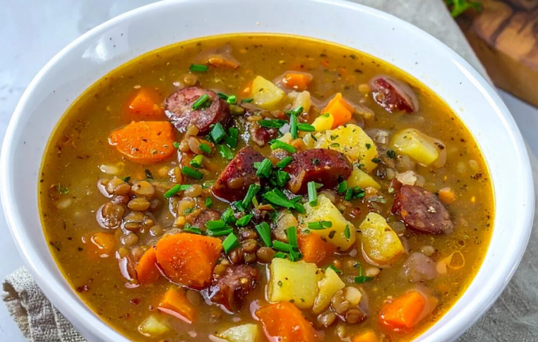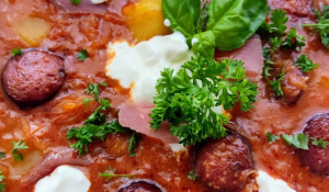- Na závěr orestujte klobásu, přidejte ji do polévky spolu s česnekem a majoránkou.