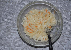 - Přidejte 3 lžíce octa, olej, hořčici a cukr, dobře promíchejte.